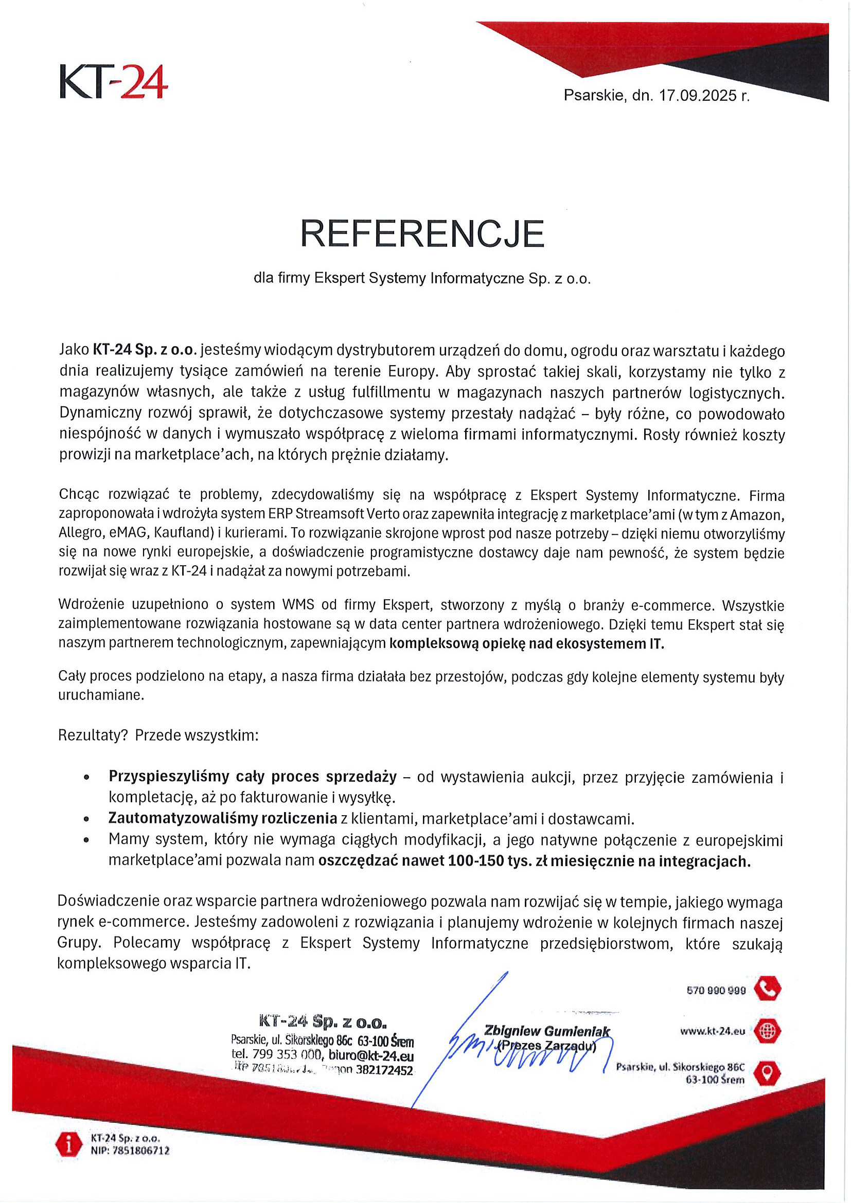W związku z dynamicznym rozwojem i rosnącą liczbą zamówień, w KT24 wdrożyliśmy system ERP Streamsoft Verto, zapewniający pełną integrację z marketplace’ami (m.in. Amazon, Allegro, eMAG, Kaufland) oraz obsługę kurierską. Dzięki temu rozwiązaniu firma: